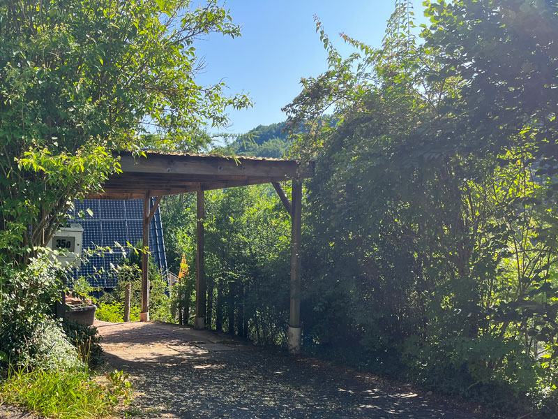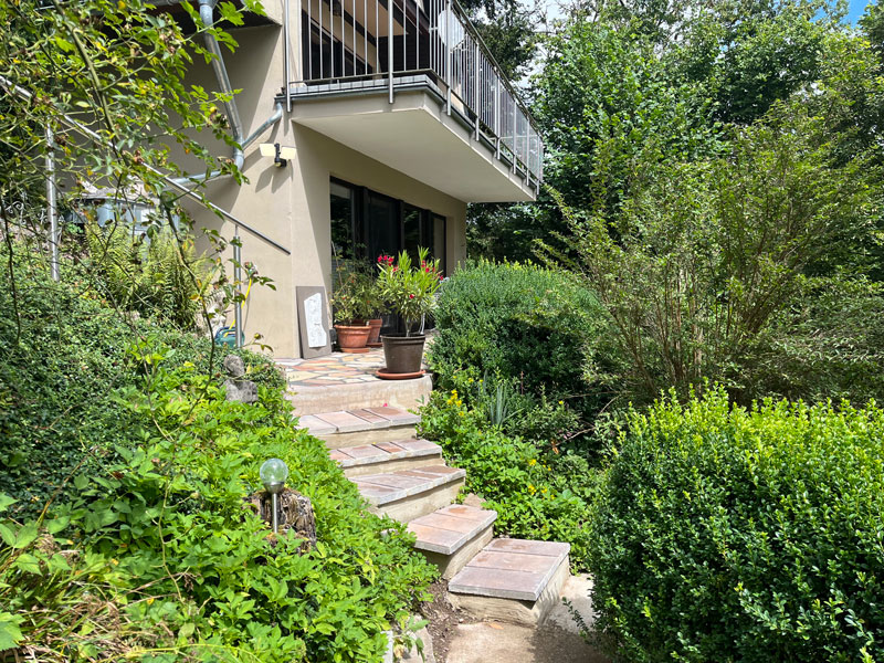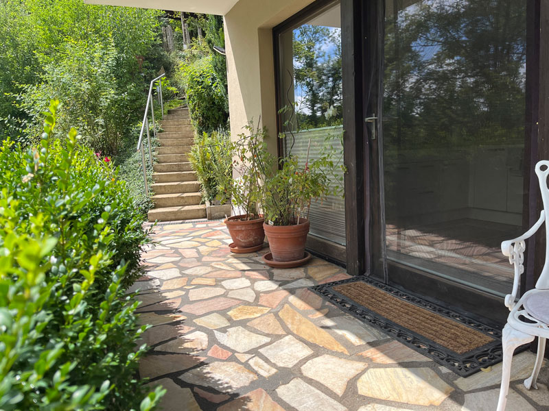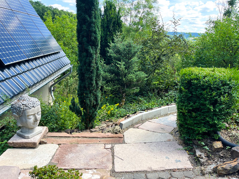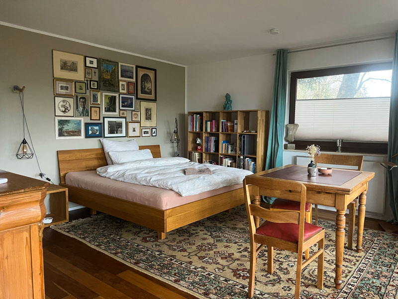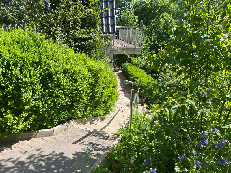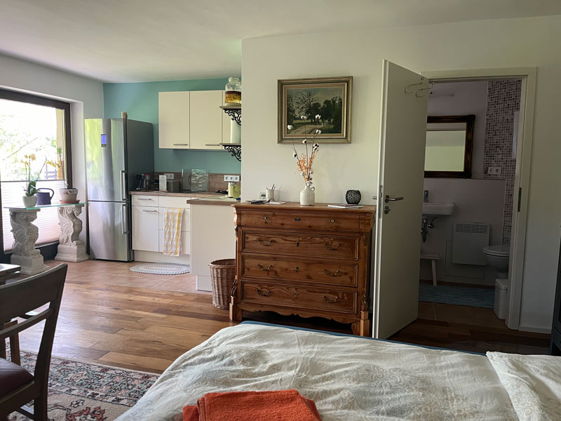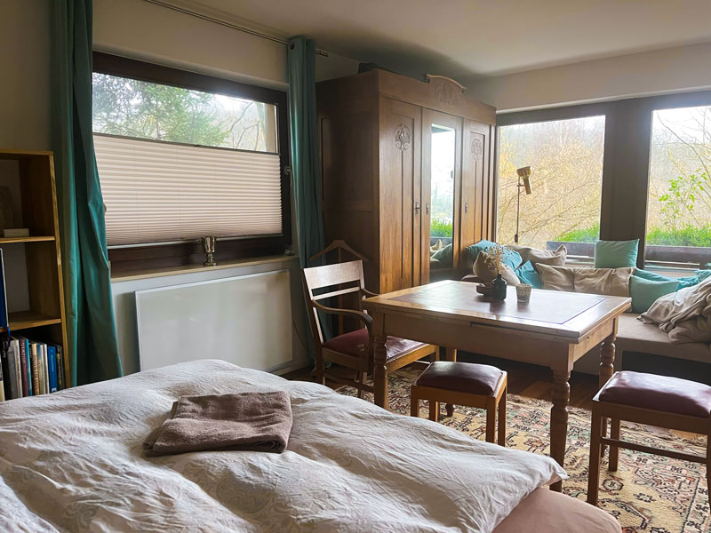 Die obere Ebene des LY-Hauses bewohnen Andreas und Tamara, der Betreiber der CASA SMI. Im LY-Haus befindet sich auf der unteren Ebene (am Hang quasi ebenfalls Erdgeschoss) das Gästestudio für 1-2 Personen mit separatem Zugang – von der Straße aus durch das Carport, über den Gartenweg, dann rechts die Treppe herunter – perfekt für innere Einkehr & persönliche Auszeiten. Es ist mit einem 1,80 m breiten Doppelbett, kleiner Einbauküche und Bad mit kleiner Eckbadewanne ausgestattet. Weiterhin findest du in der Küche einen Wasser-, Kaffeekocher und Milchaufschäumer und kannst dich auf Wunsch selbst verpflegen, oder – außerhalb der Gruppenveranstaltungen – Teil- oder Vollverpflegung bei uns buchen. W-Lan ist vorhanden – auch wenn wir in den persönlichen Auszeiten Digital-Detox und Naturwanderungen empfehlen! 🙂